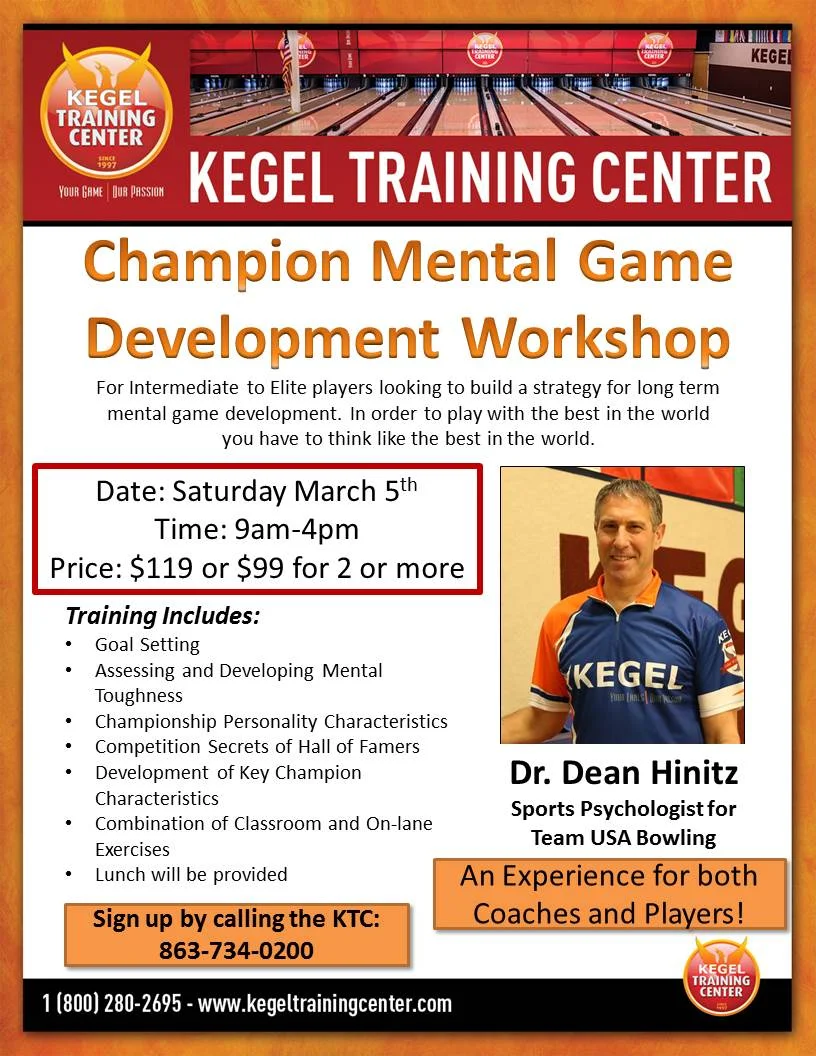 Champion Mental Game Development Workshop w/Dr Dean Hinitz Saturday, March 5, 2016 9:00 AM 5:00 PM Google Calendar ICS For Intermediate to Elite players looking to build a strategy for long term mental game development. In order to play with the best in the world you have to think like the best in the world.